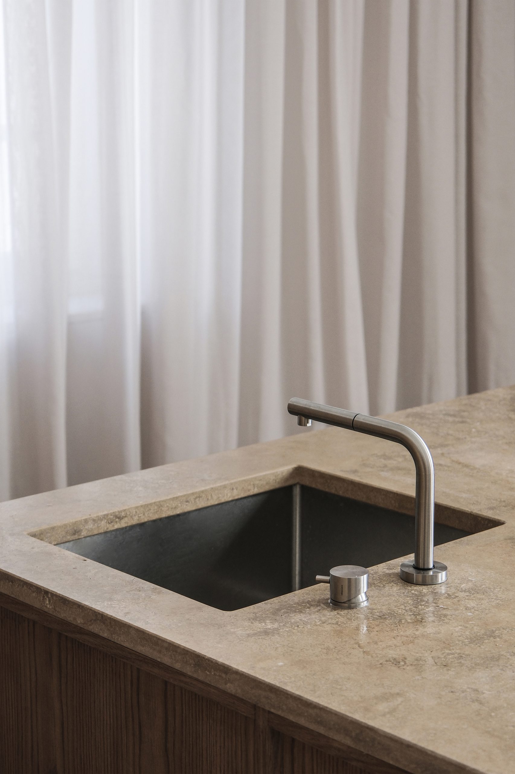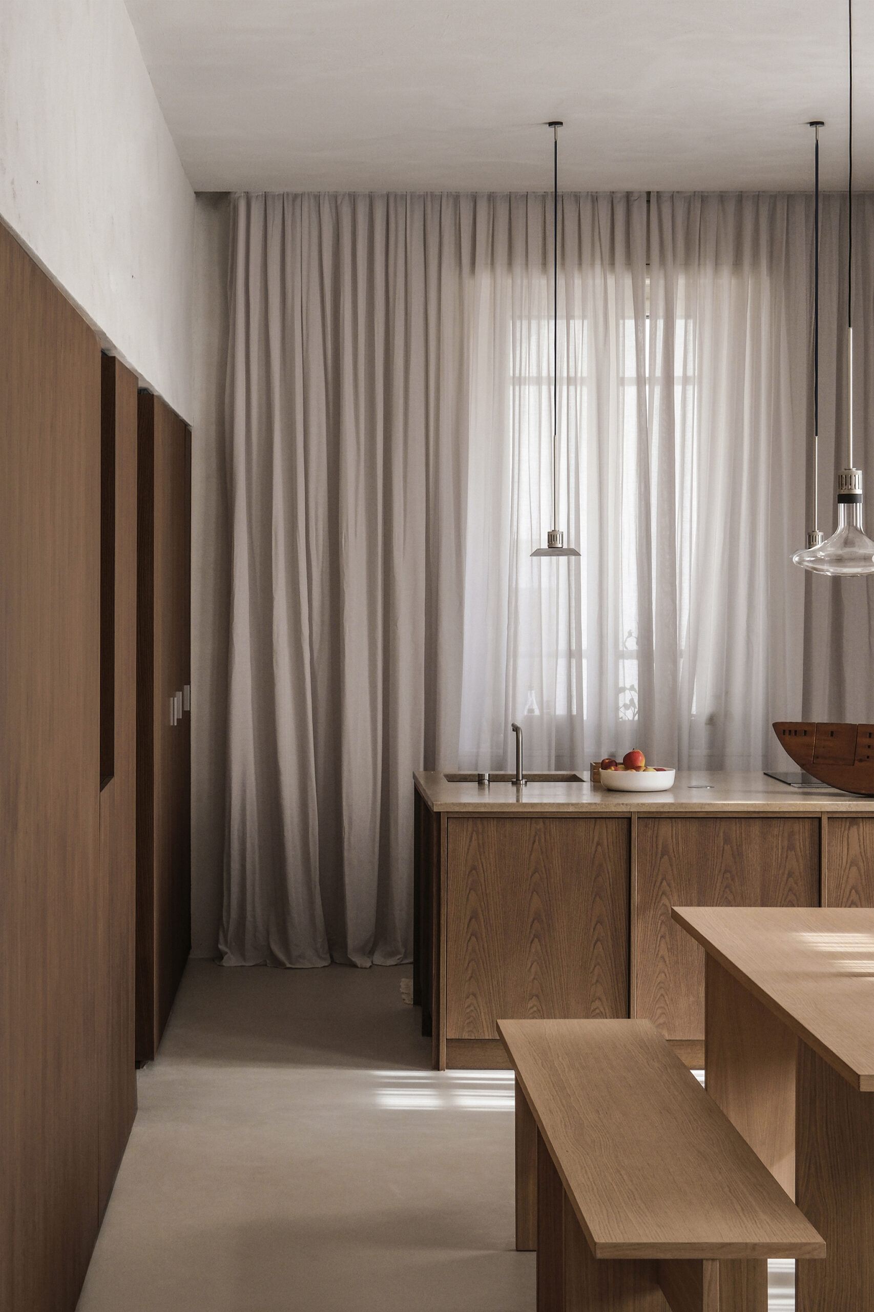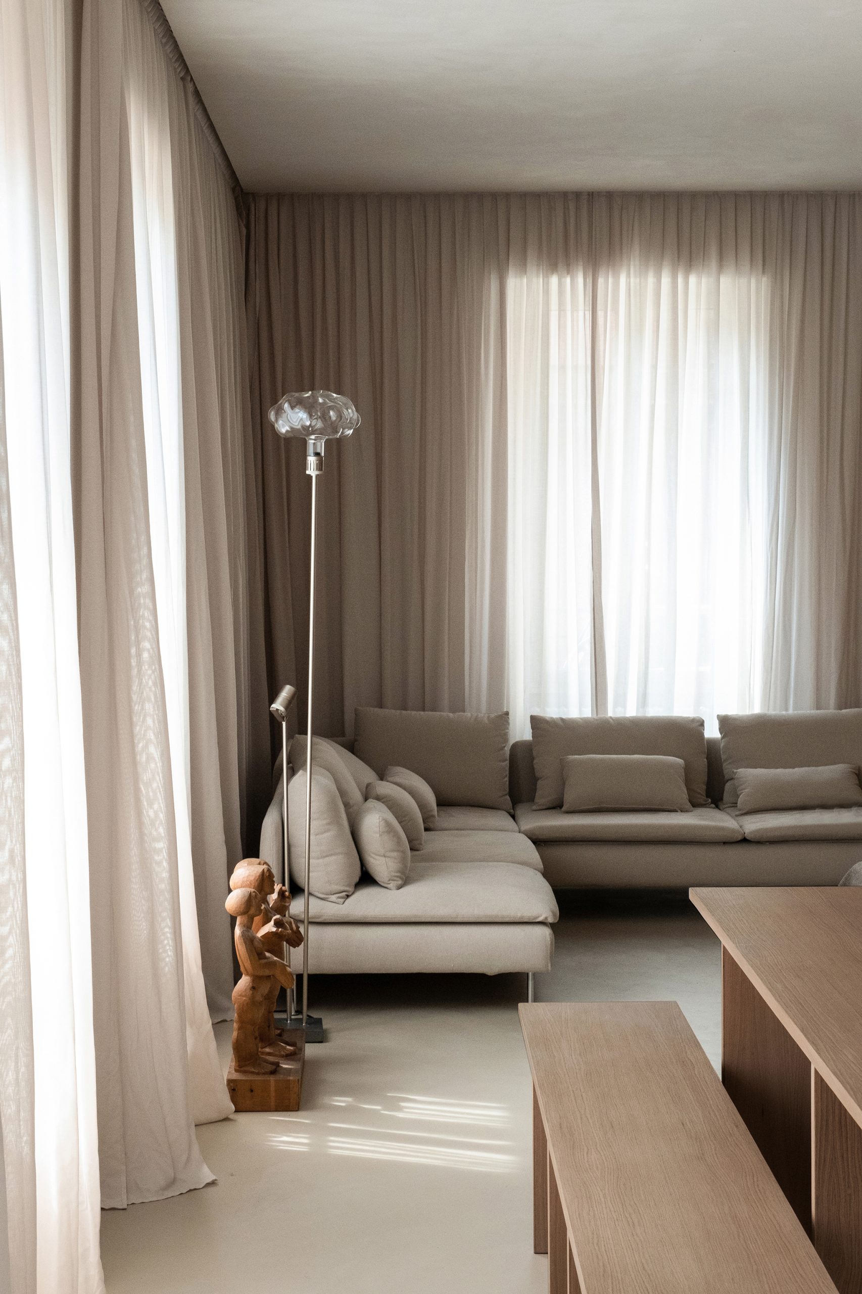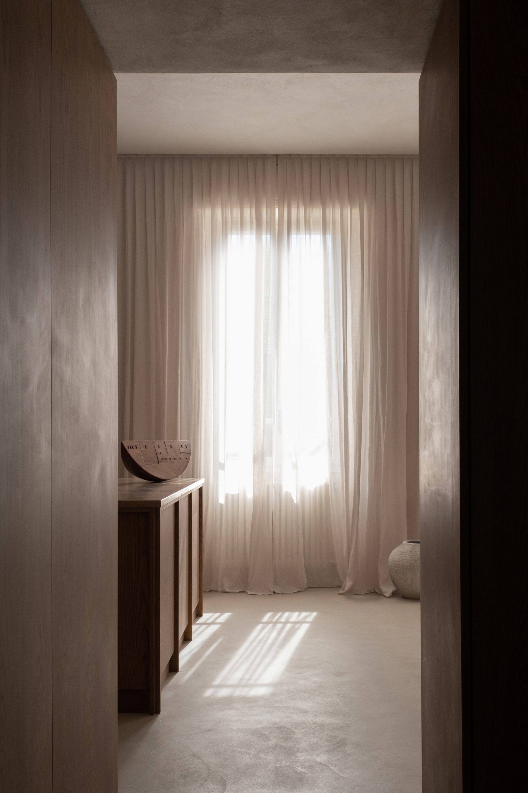 Around the entire perimeter of the apartment, a membrane of long linen curtains has been designed to screen the sunlight, creating a suspended atmosphere while also ensuring privacy from the surrounding buildings.