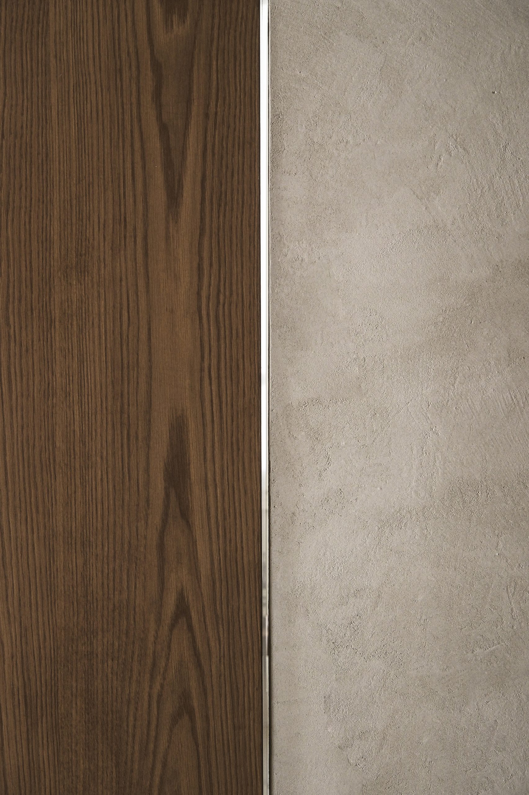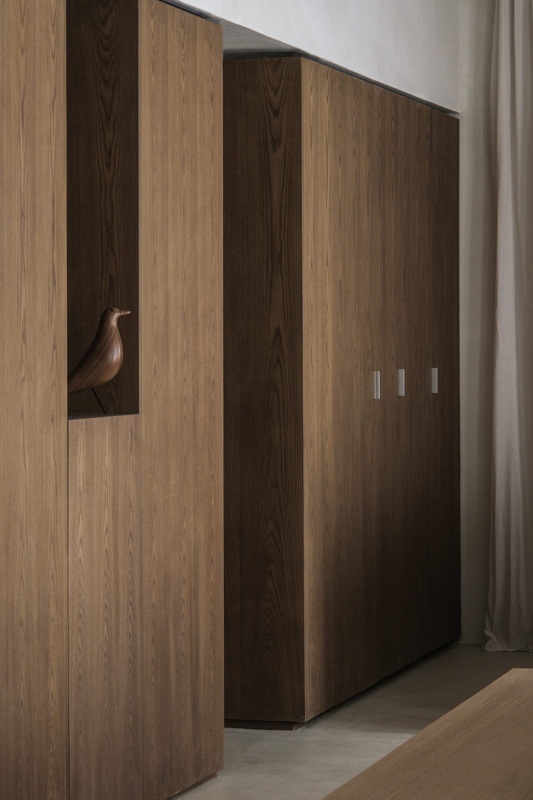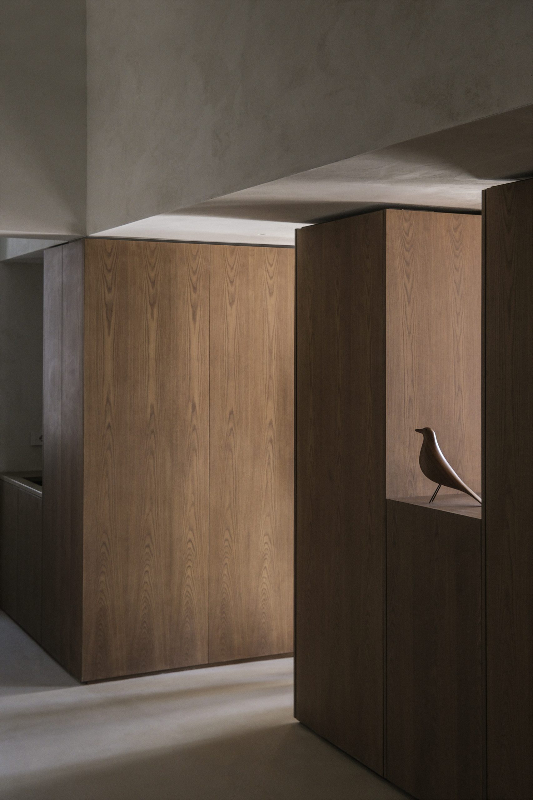 In APARTMENT NN all the infrastructures at the service of the living are contained within a long spine equipped in oak wood that crosses the apartment tangentially to the void.
