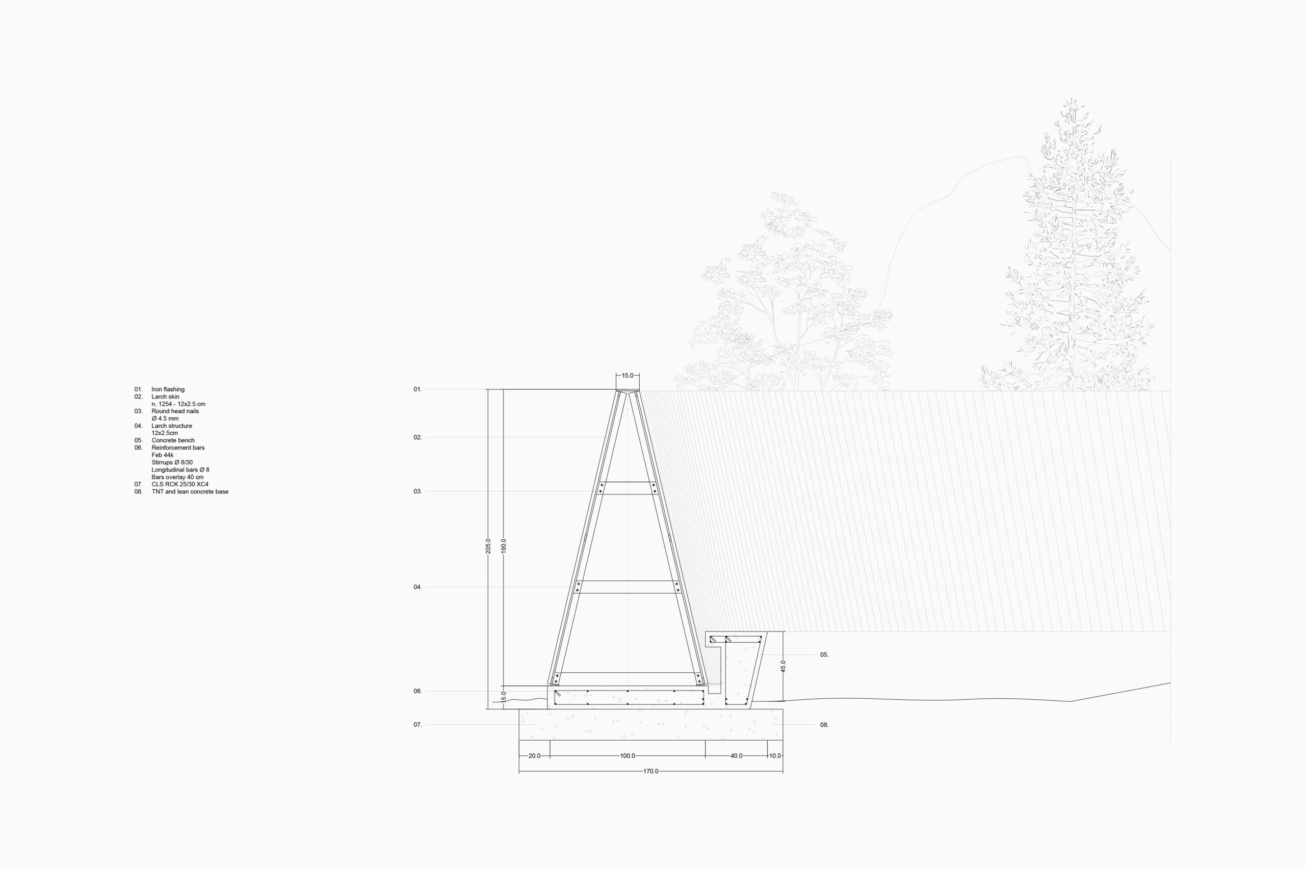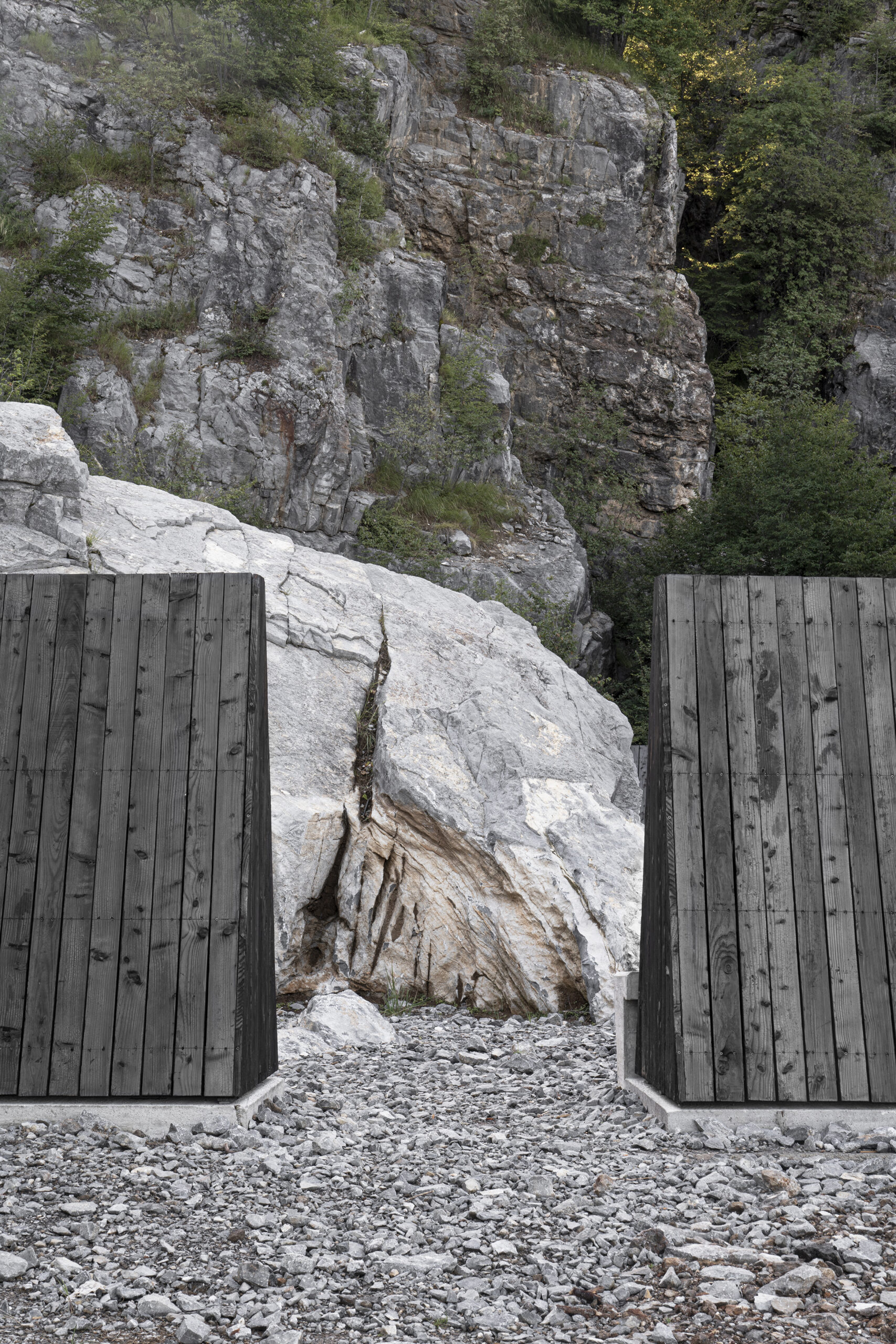 The monument ECHO OF THE MOUNTAIN honors the memory of all those who once labored in Dossena’s now-abandoned mines. The project features a circular enclosure inspired by traditional wooden fences, embracing a large stone sculpture by artist Francesco Paterlini. This setting isolates the stone from its surroundings, imbuing it with a contemplative and symbolic presence. The enclosure consists of a concrete base that extends halfway around the circle to form a long bench for community gatherings. A charred, pyramid-shaped wooden structure is set atop the concrete, running continuously along its entire length.