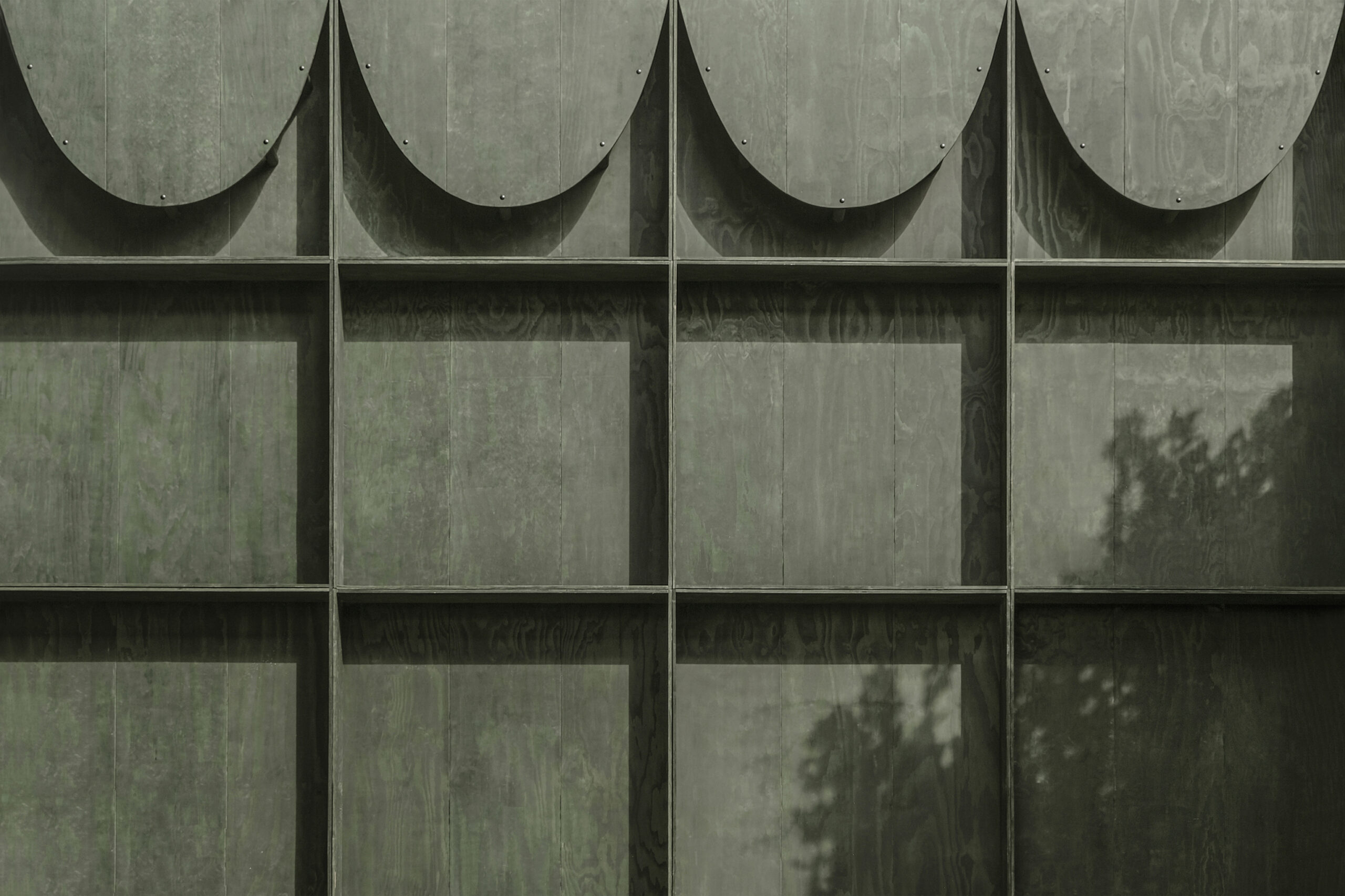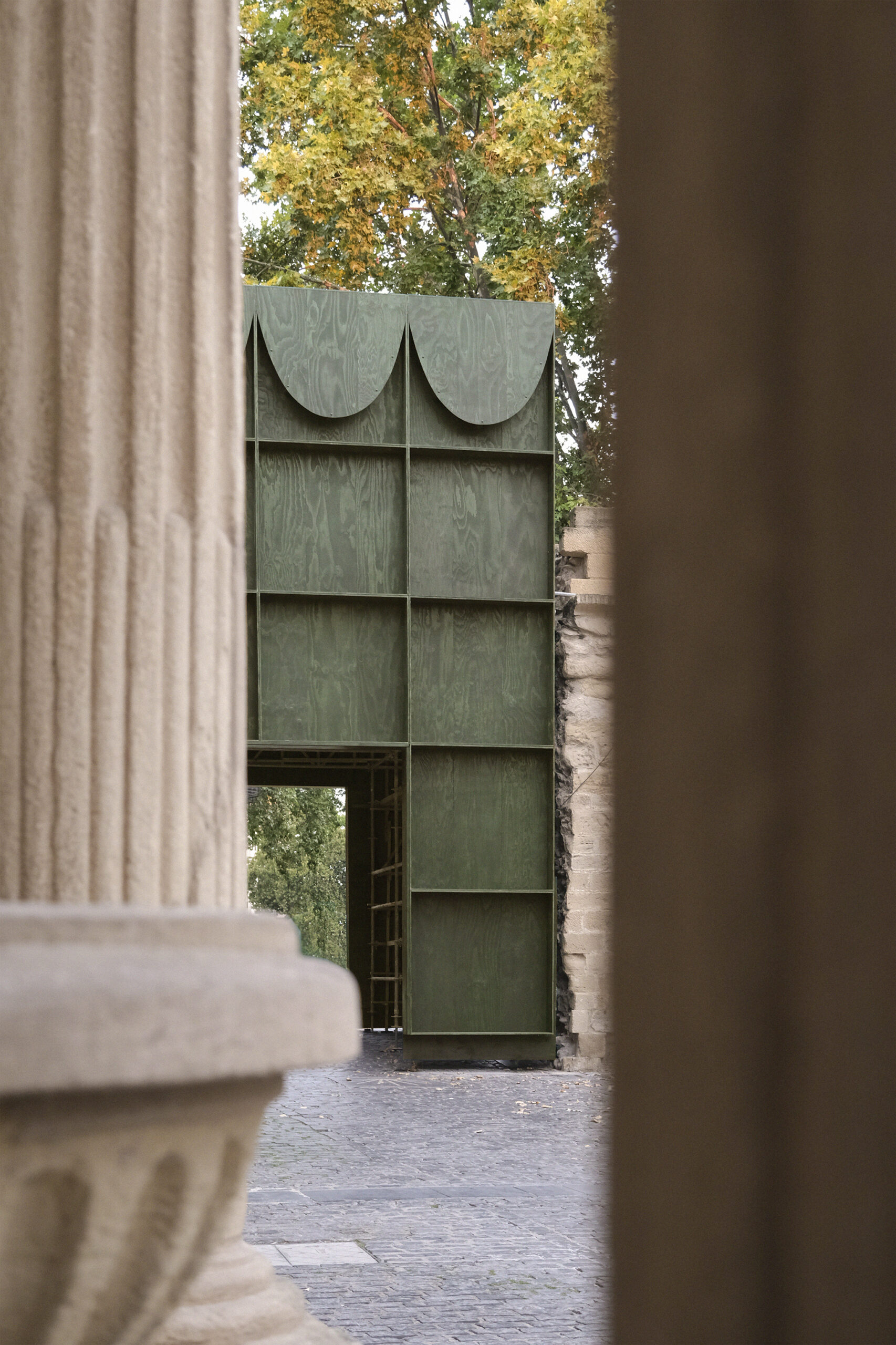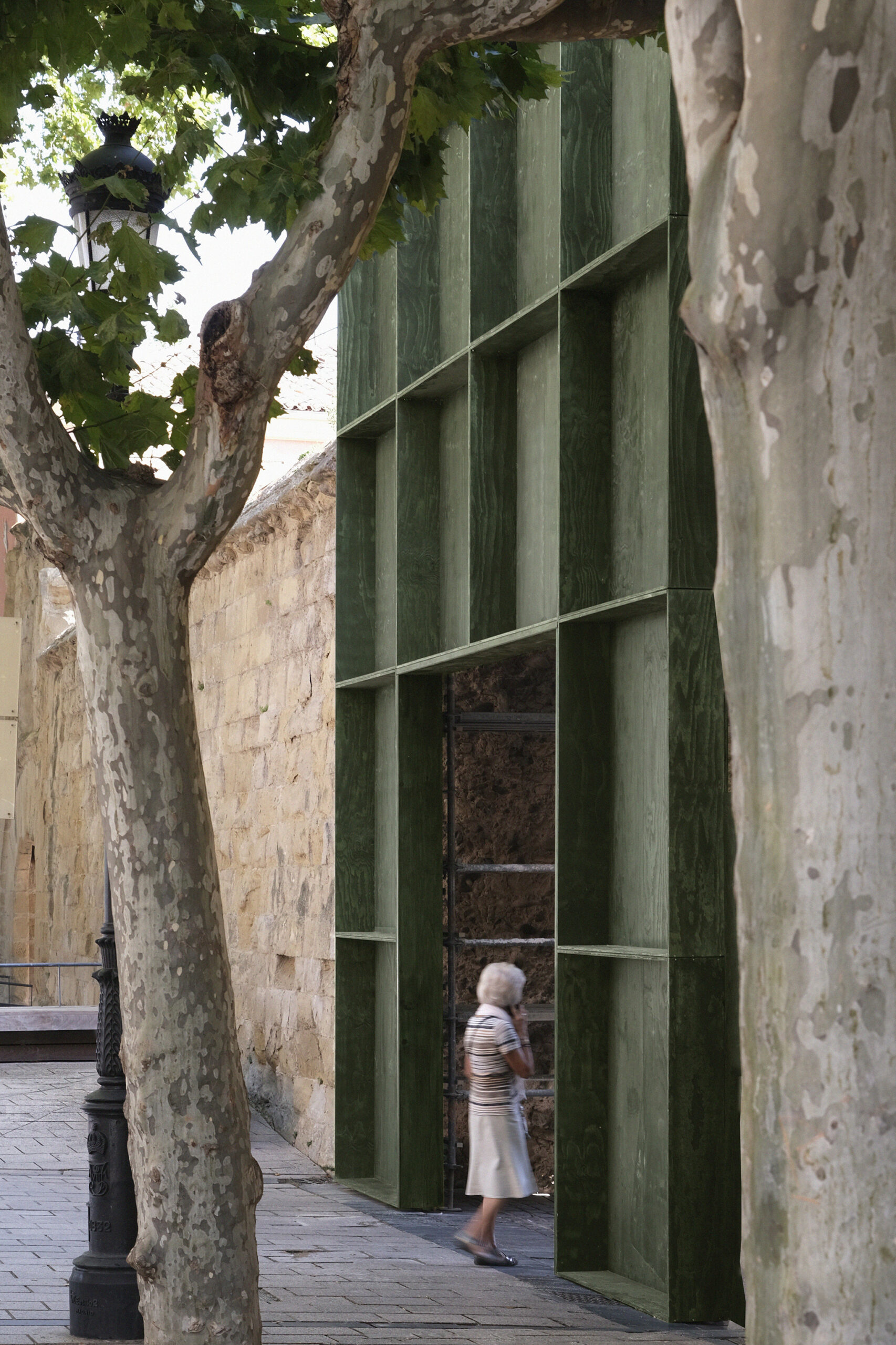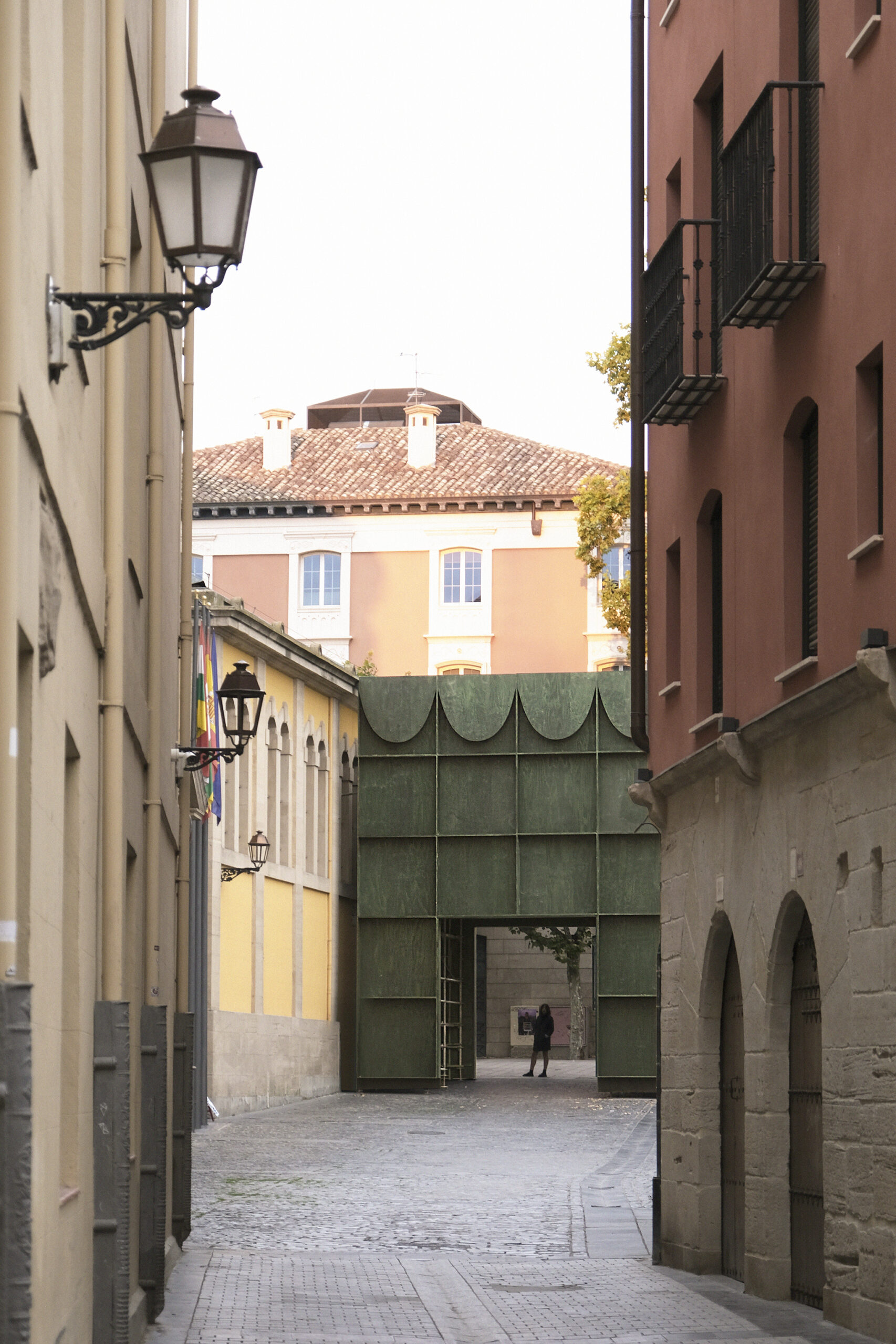 The portal, made of green-painted wood, evokes the image of the temporary gateways built in the city of Logroño during the Fiesta de San Bernabè, as well as the shape of the nearby Revellín Gate, thus seeking a historical, morphological, and material connection with the city and the collective memory of its inhabitants.